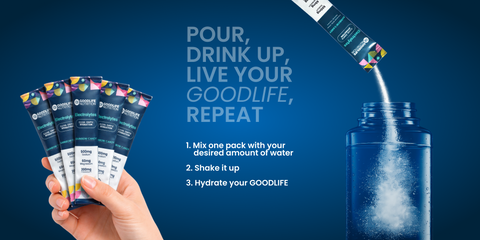 GOODLIFE Electrolytes replenishes vital minerals lost through sweat, ensuring optimal performance and recovery. Sodium, Potassium, and Magnesium, work synergistically to support muscle function, nerve transmission, and fluid balance.